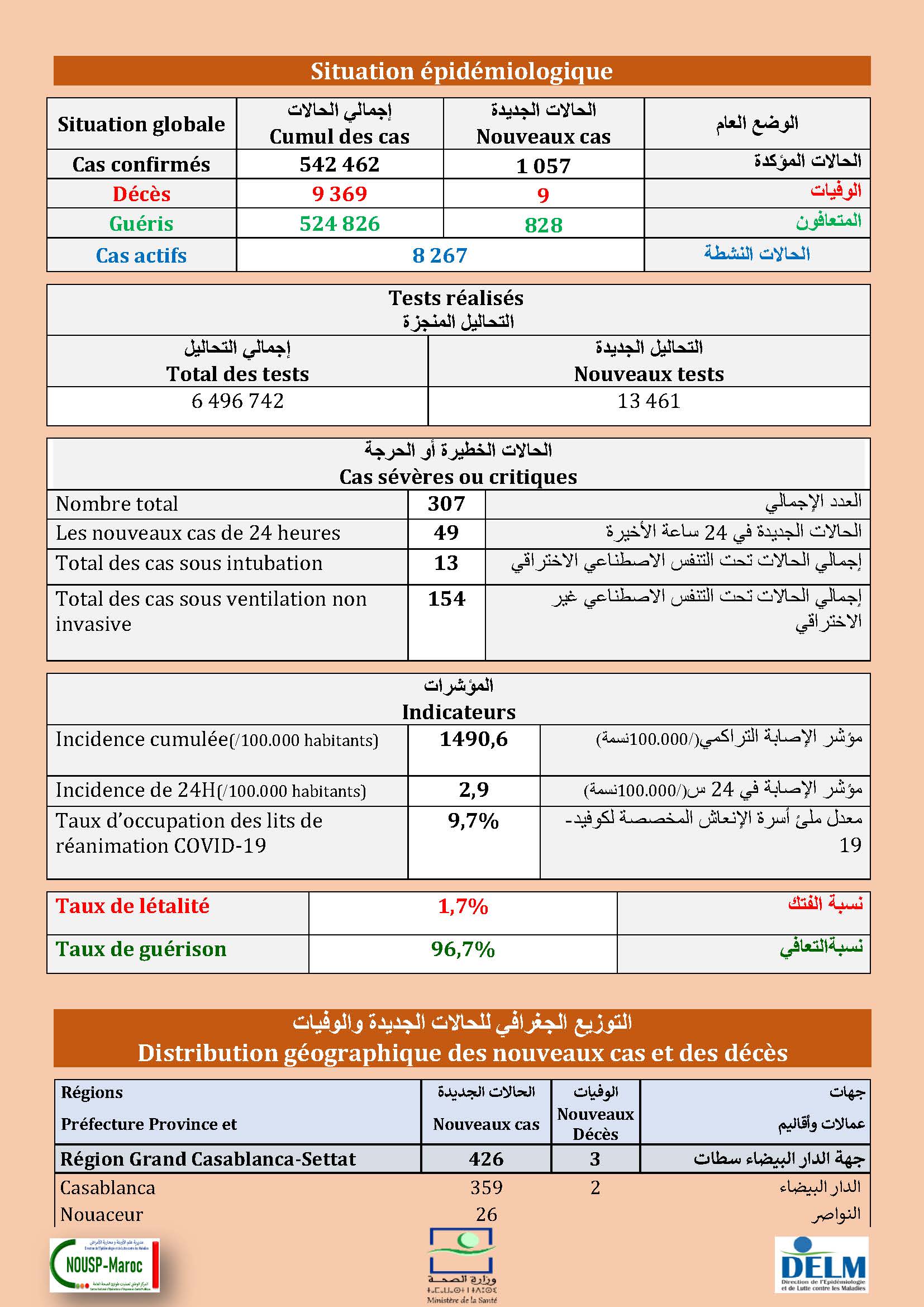 1057 nouveaux cas soit un cumul de 542.462 cas à ce jour.