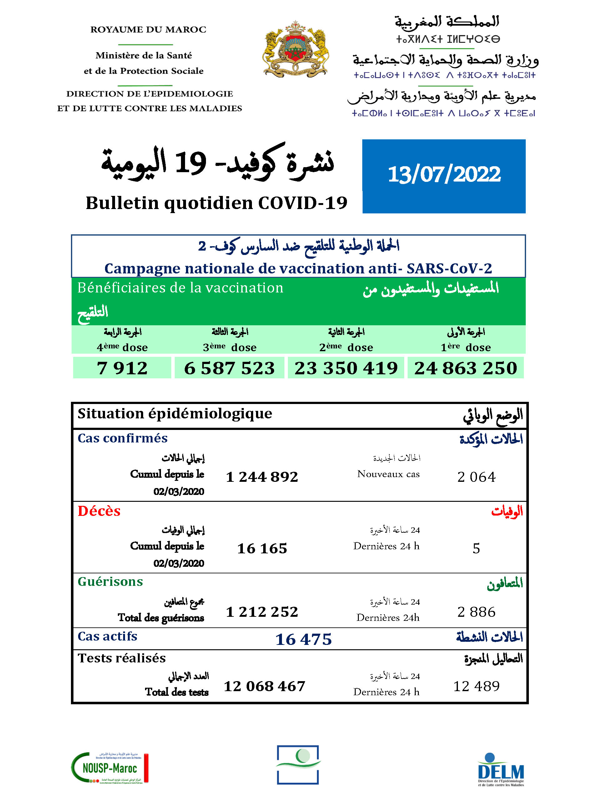 2064 nouveaux cas soit un cumul de 1 244 892 cas à ce jour.