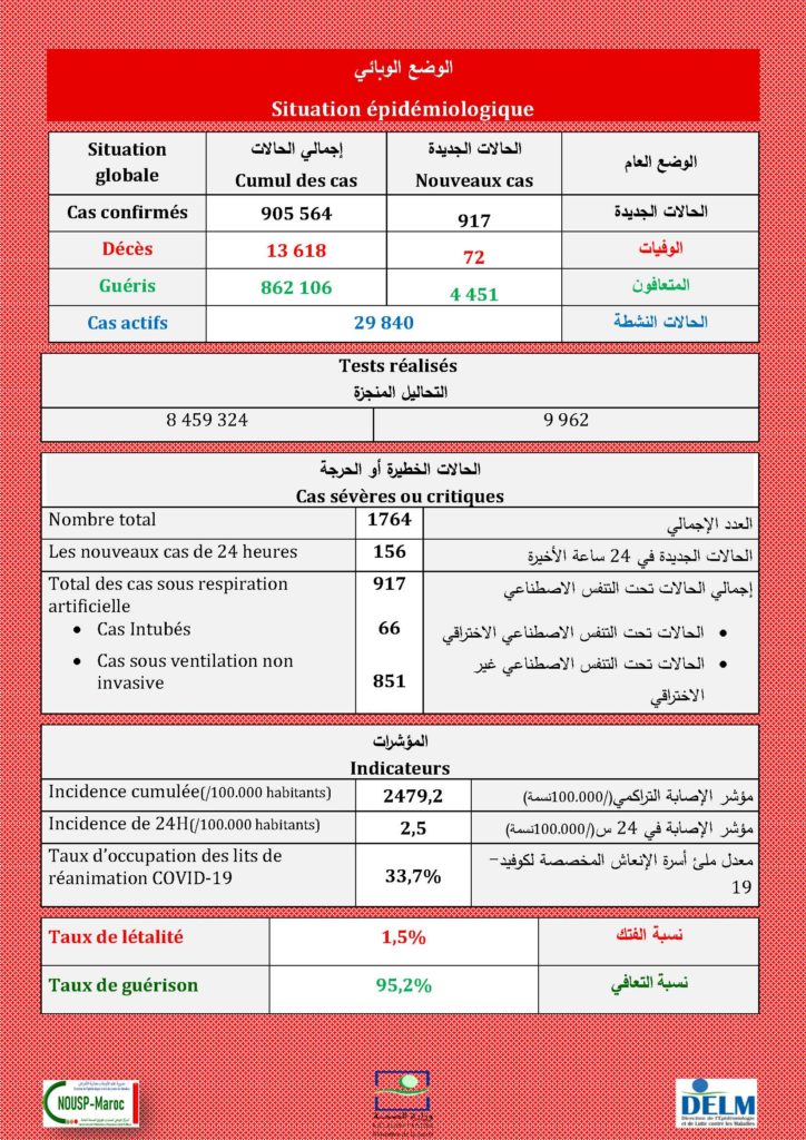 917 nouveaux cas soit un cumul de 905.564 cas à ce jour.