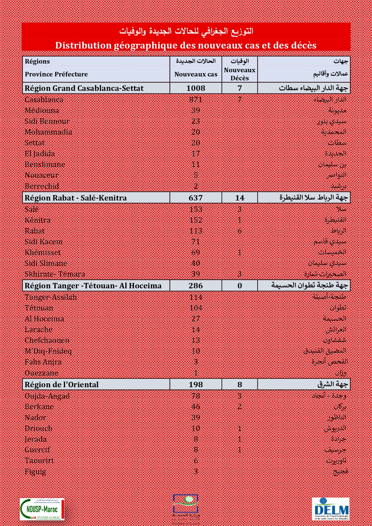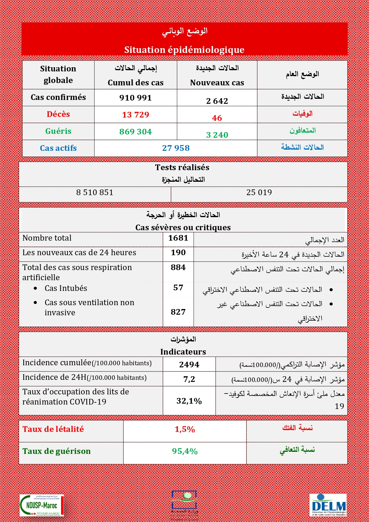 2.642 nouveaux cas soit un cumul de 910.991 cas à ce jour.