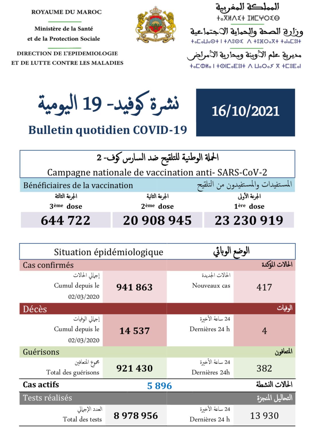 417 nouveaux cas soit un cumul de 941.863 cas à ce jour.