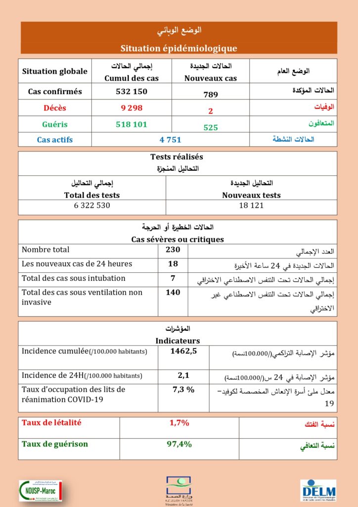 789 nouveaux cas soit un cumul de 532.150 cas à ce jour.