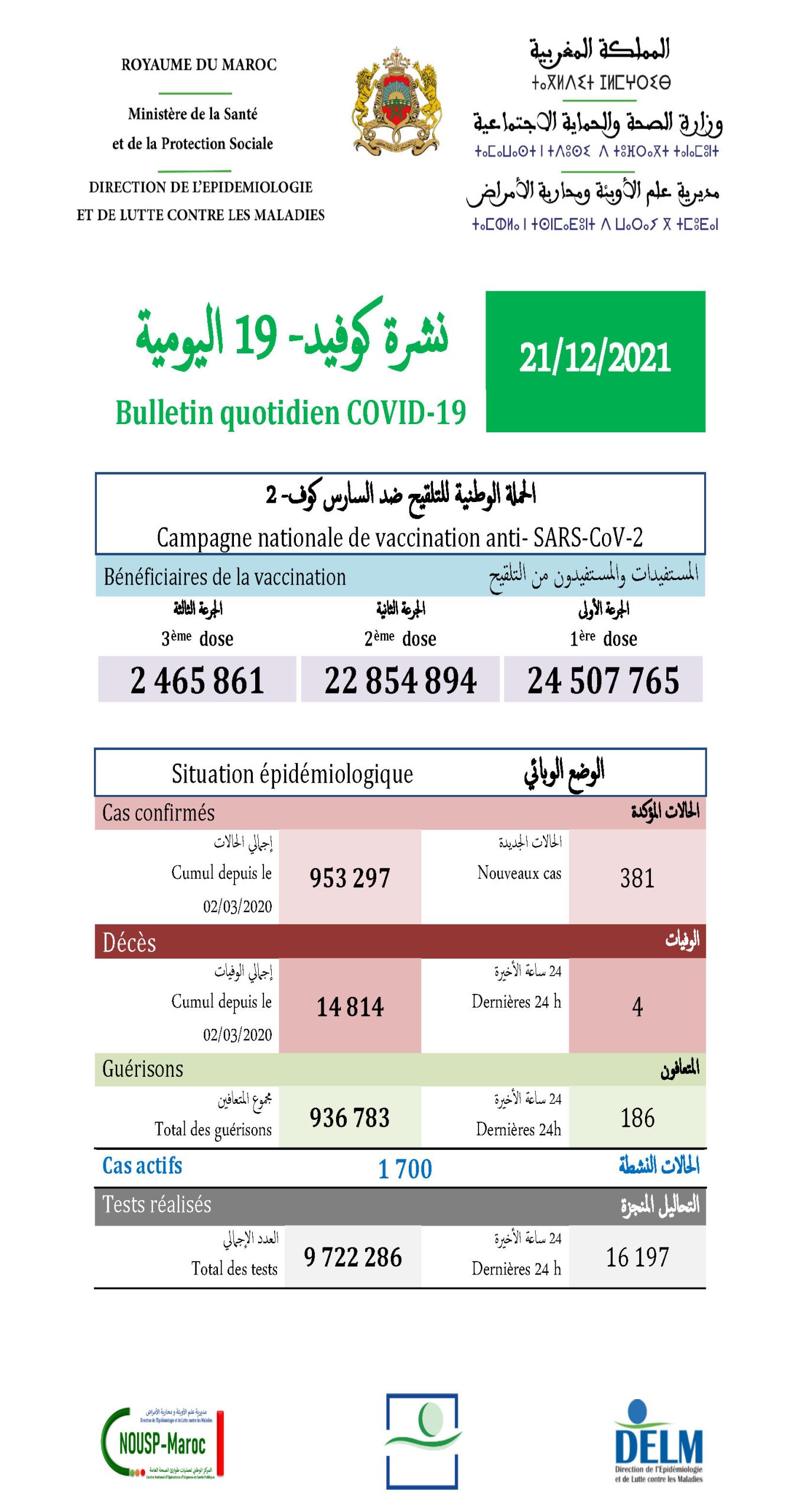 381 nouveaux cas soit un cumul de 953 297 cas à ce jour.