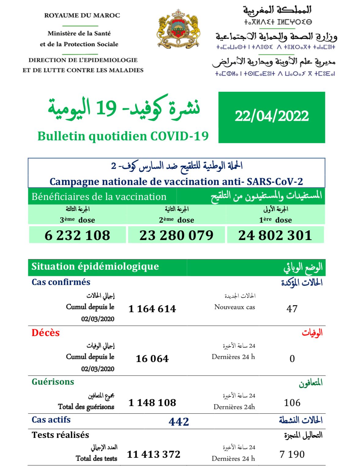 ZÉRO DÉCÈS donc un cumul de 16.064 à ce jour.