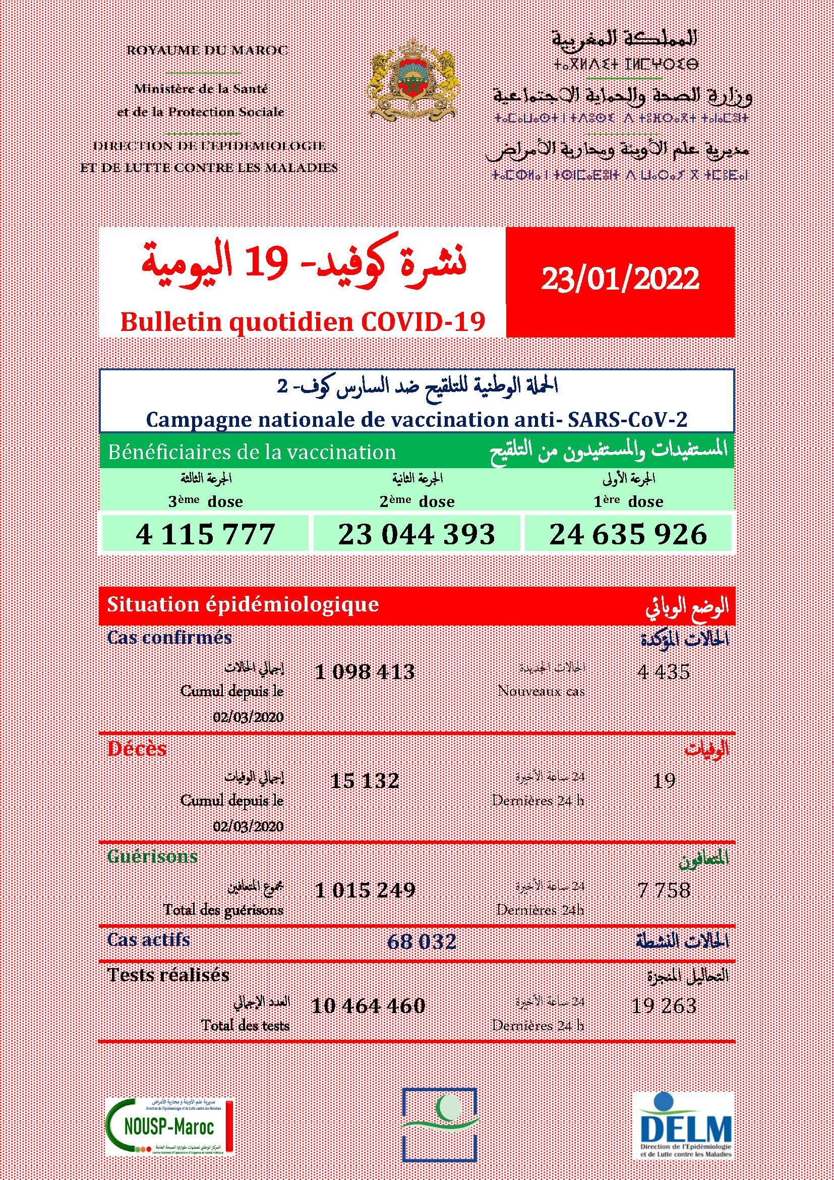 4 435 nouveaux cas soit un cumul de 1 098 413 cas à ce jour.