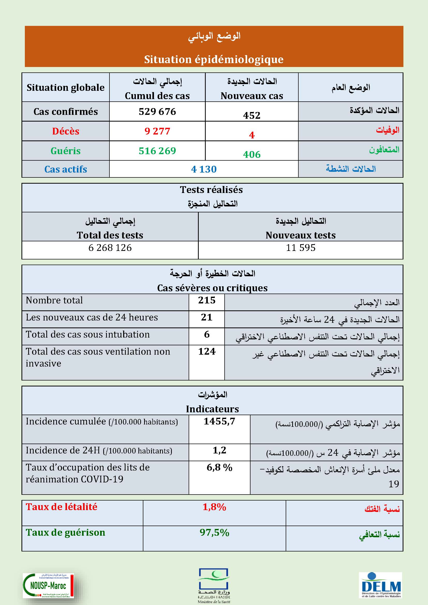 452 nouveaux cas soit un cumul de 529.676 cas à ce jour.