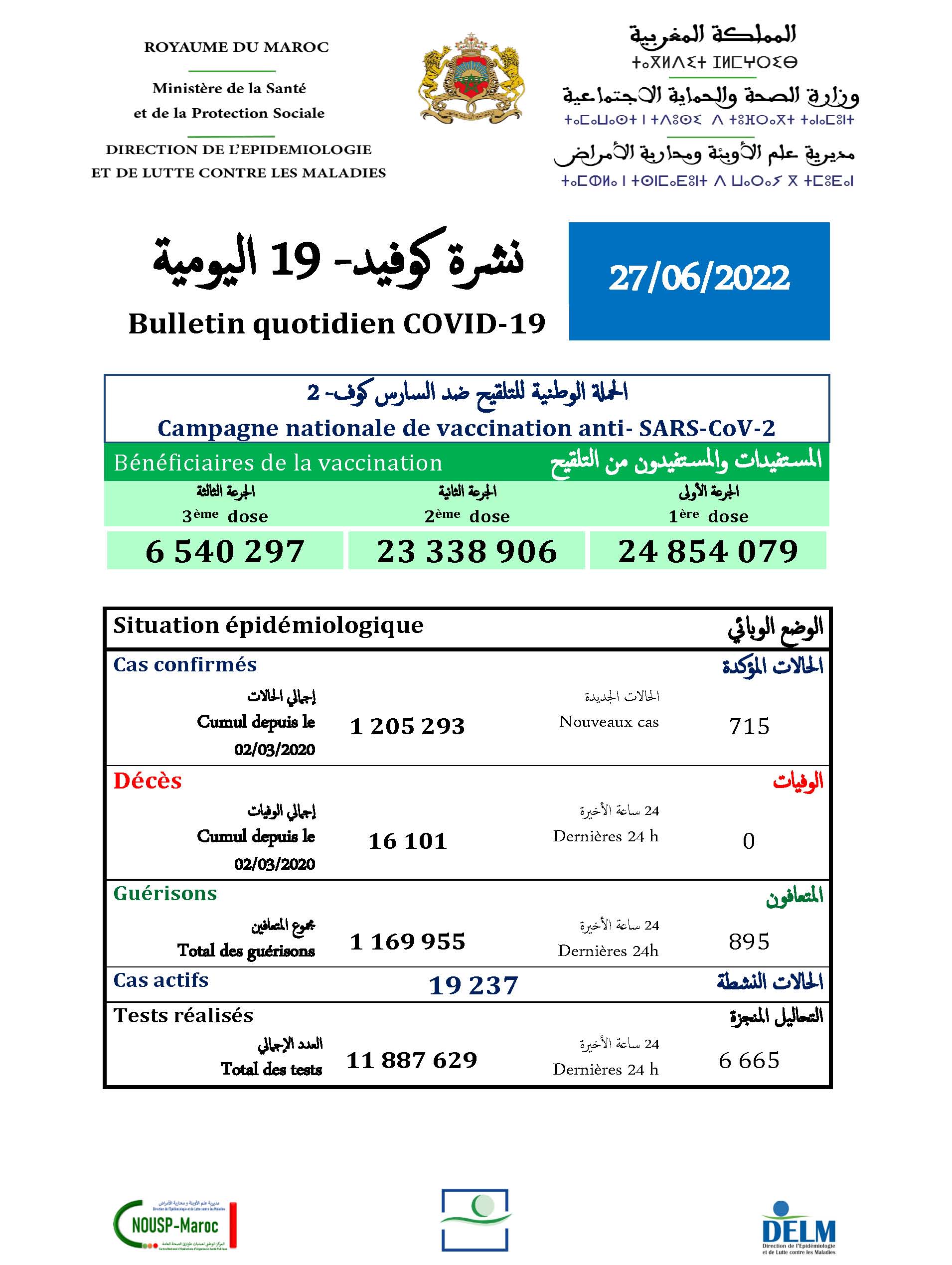 715 nouveaux cas soit un cumul de 1.205.293 cas à ce jour.