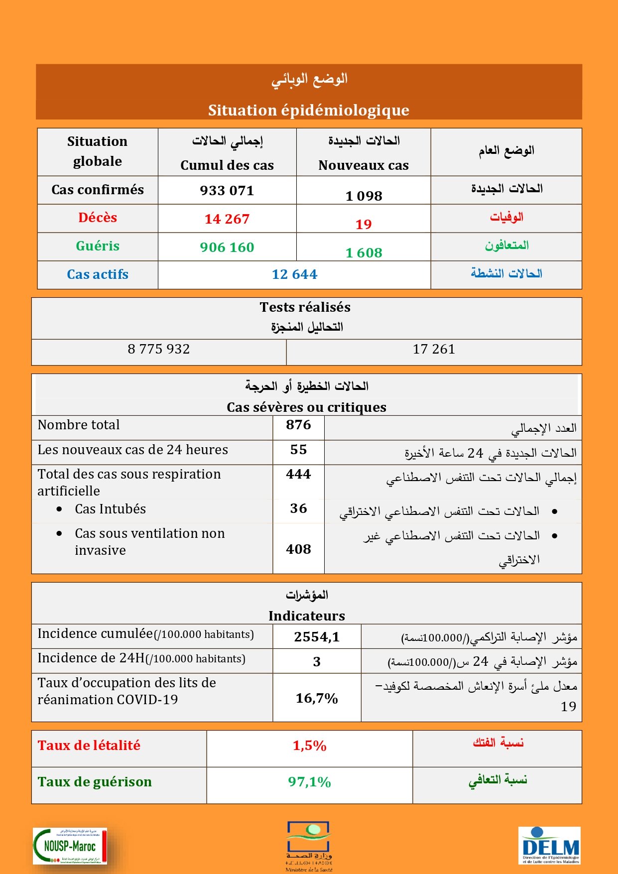 1 098 nouveaux cas soit un cumul de 933 071 cas à ce jour.
