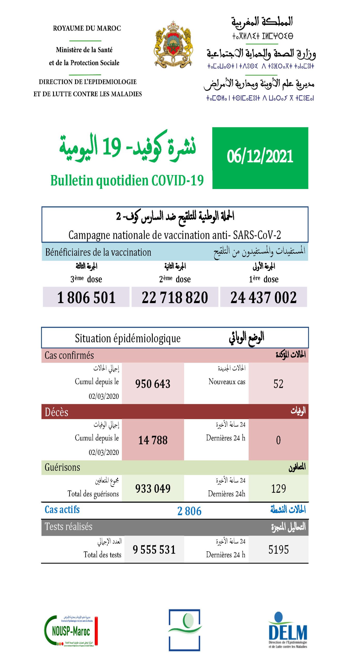 52 nouveaux cas soit un cumul de 950 643 cas à ce jour.