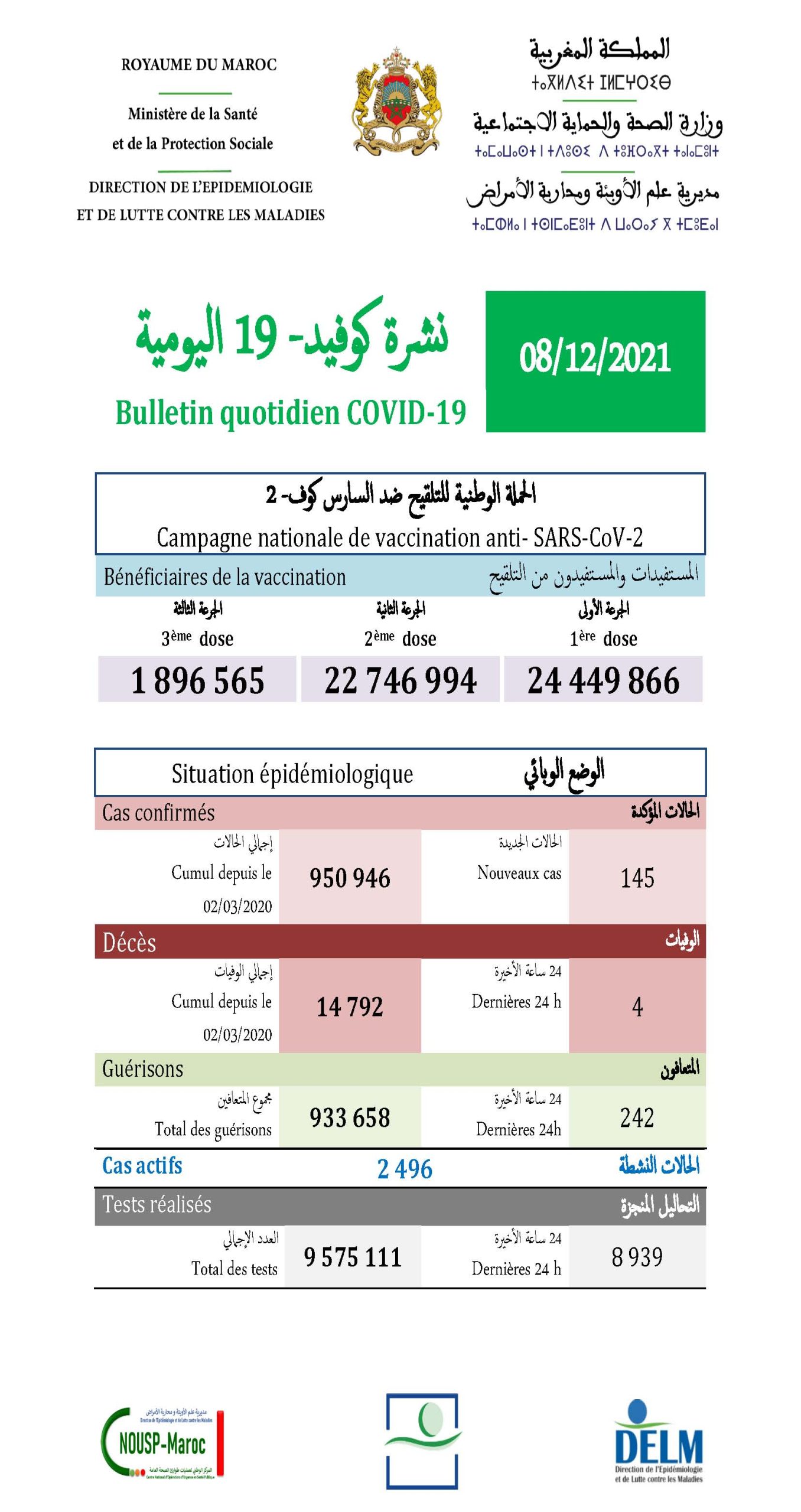 242guérisons soit un cumul de 933 658 à ce jour.