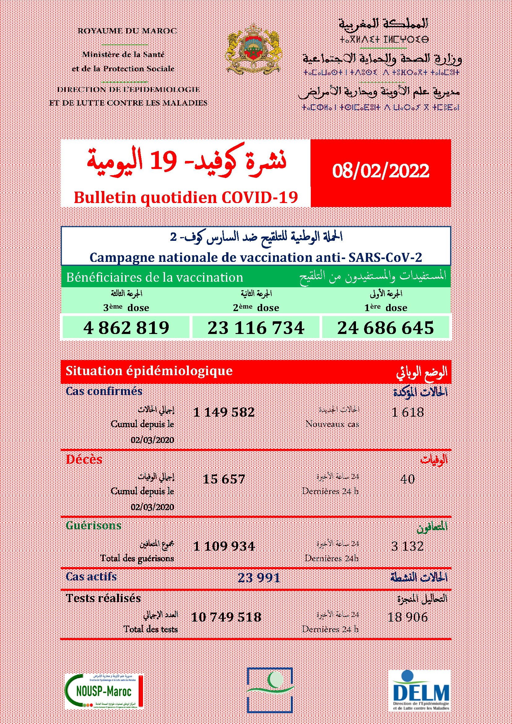 3 132 guérisons soit un cumul de 1 109 934 à ce jour.