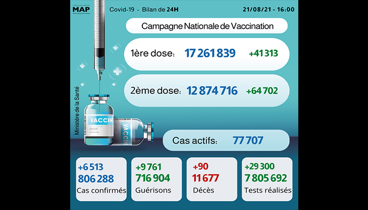 Le nombre de primo-vaccinés est de 17.261.839, alors que celui des personnes complètement vaccinées (1ère et 2ème doses) s’élève à 12.874.716, a précisé le ministère dans son bulletin quotidien sur la situation épidémiologique Covid-19.