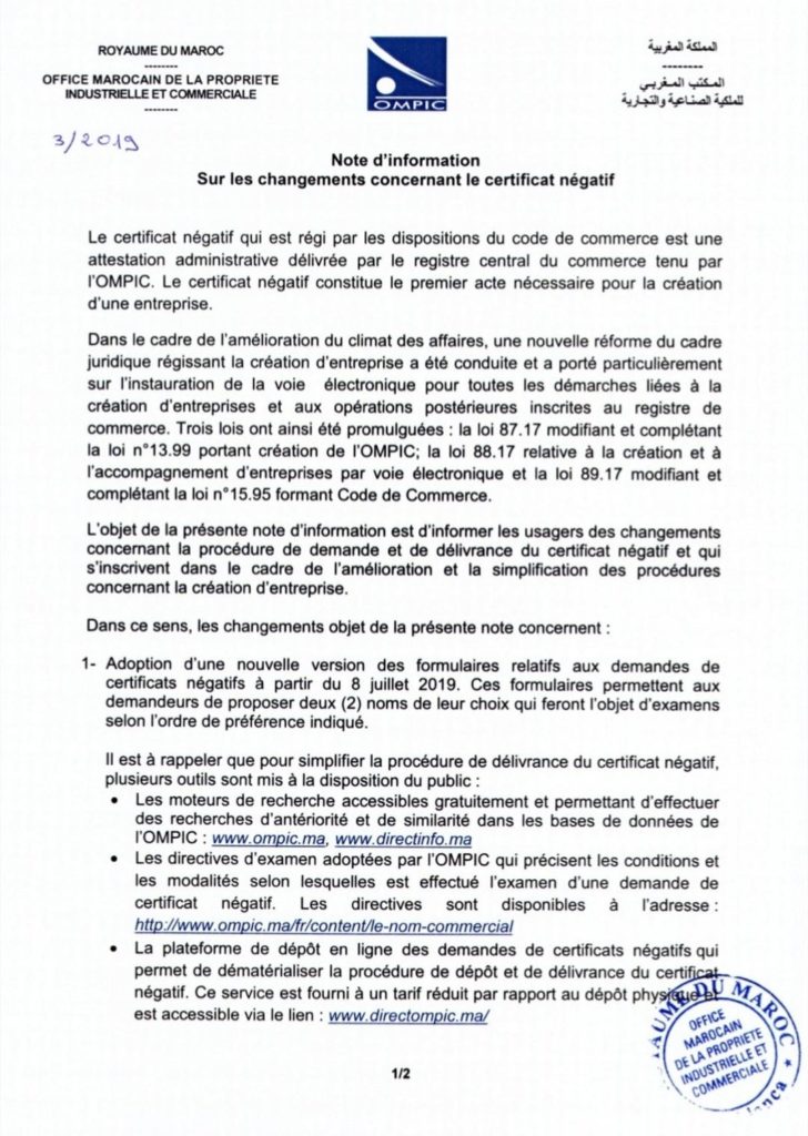 L’objet de la présente note d’information publié par l’Office marocain de la propriété industrielle et commerciale (OMPIC) est d’informer les usagers des changements concernant la procédure de demande et de délivrance du certificat négatif et qui s’inscrivent dans le cadre de l’amélioration et la simplification des procédures concernant la création d’entreprise.