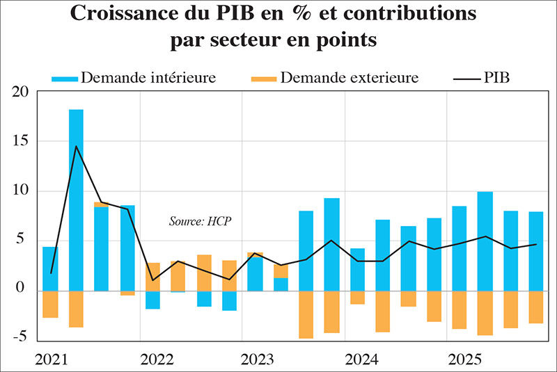 De quoi soutenir les exportations marocaines, tout en consolidant les moteurs internes: la consommation des ménages continuerait de progresser (+4,4%), stimulée par la revalorisation des salaires publics et la baisse de l’impôt sur le revenu, tandis que l’investissement se maintiendrait à un niveau élevé (+12,6%). Les services et la construction contribueraient ensemble à près d’un demi-point de croissance, confirmant la diffusion progressive de la reprise dans l’économie réelle.