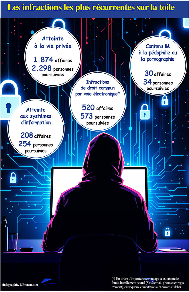 L’atteinte à la vie privée y occupe largement la première place: 1.874 affaires en 2023. S’y ajoutent également les infractions de droits communs comme le chantage et l’extorsion, le harcèlement sexuel par voie électronique (Voir illustration). Parmi les affaires d’atteinte aux systèmes d’information, figurent celles relatives à l’accès ou la suppression de données relatives à la sécurité intérieure et extérieure de l’Etat ou des secrets liés à l’économie nationale. Une dizaine de dossiers judiciaires en 2023, selon les derniers chiffres de la présidence du ministère public.