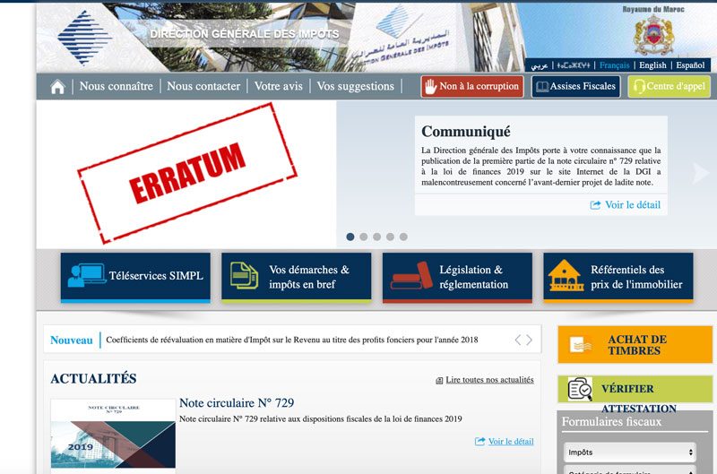 La Direction Générale des impôts (DGI) vient de publier un erratum concernant sa note circulaire n° 729 relative à la loi de finances 2019 . Une nouvelle version de cette note a été mise en ligne, l’ancienne «a malencontreusement concerné l’avant-dernier projet de ladite note», précise la DGI.