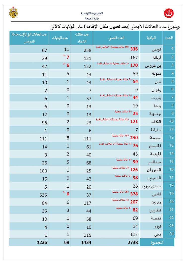 Le ministère de la Santé a annoncé 4 nouveaux décès ( 1 à l’Ariana, 2 à Ben Arous et un à Gabes) et 131 nouvelles atteintes au Coronavirus dont 124 locales et 7 importées.