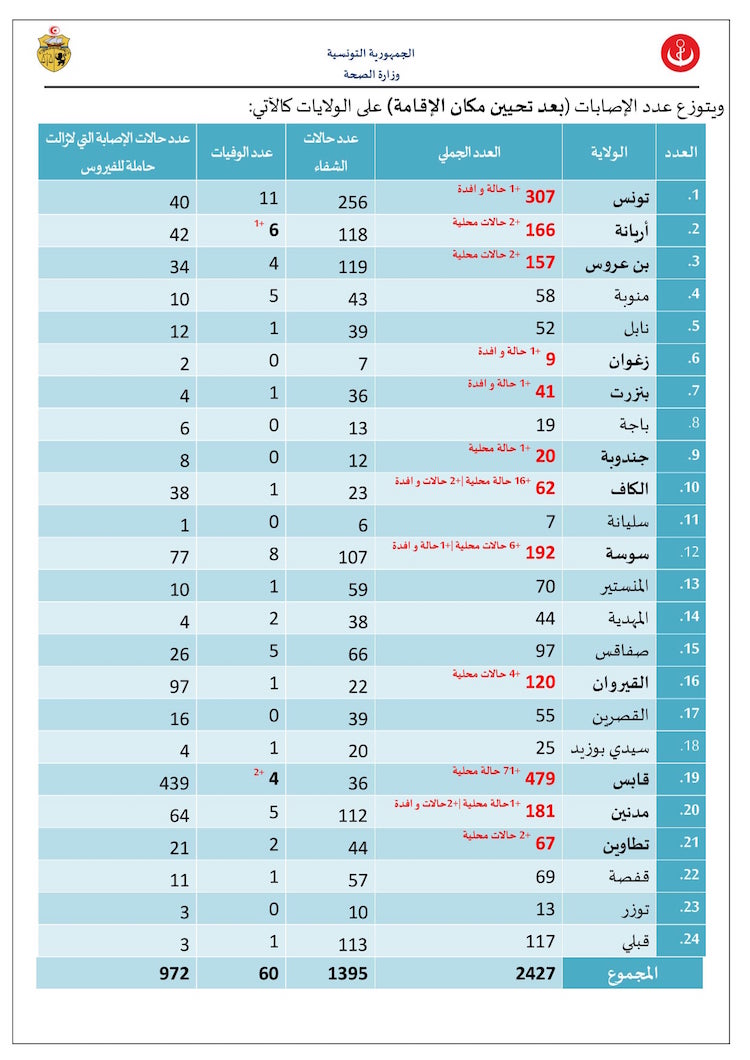 Le ministère de la Santé a annoncé 1 nouveau décès (à l’Ariana) et 113 nouvelles atteintes au Coronavirus dont 105 locales et 8 importées.