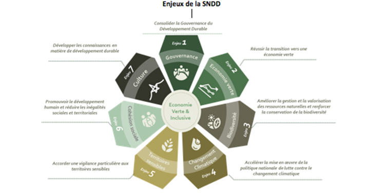 En effet, l’enjeu 2 de la SNDD met en avant les principaux secteurs productifs, au sein desquels les gisements de création de valeur et d’emplois sont importants, mais également avec un fort potentiel d’atténuation des pressions sur les ressources. Au titre de cet enjeu, 11 axes stratégiques ont été identifiés pour réussir cette transition dans plusieurs secteurs, notamment l’agriculture, l’industrie, l’urbanisme, le tourisme, le transport et l’énergie et mines.