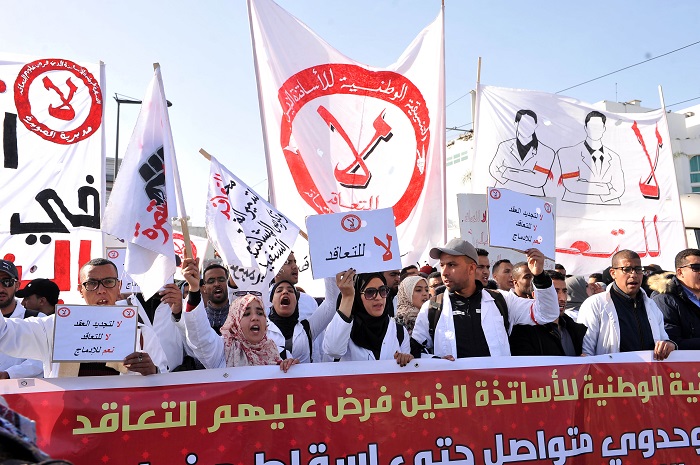 Les enseignants contractuels, dont le nombre s’élèvent à plus de 75 000 personnes, rejettent le système de contrat qui les lie aux académies régionales d’éducation et de formation et exigent qu’ils soient démobilisés en les intégrant directement dans la fonction publique.