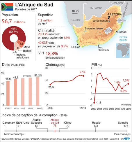 Entre 2011 et 2015, 3 millions de Sud-Africains ont basculé dans la pauvreté, soulignait l’institution. Malgré l’émergence d’une classe moyenne, 20% des foyers noirs vivent dans une extrême pauvreté contre 2,9% des foyers blancs, selon l’Institut sud-africain des relations entre les races (IRR).