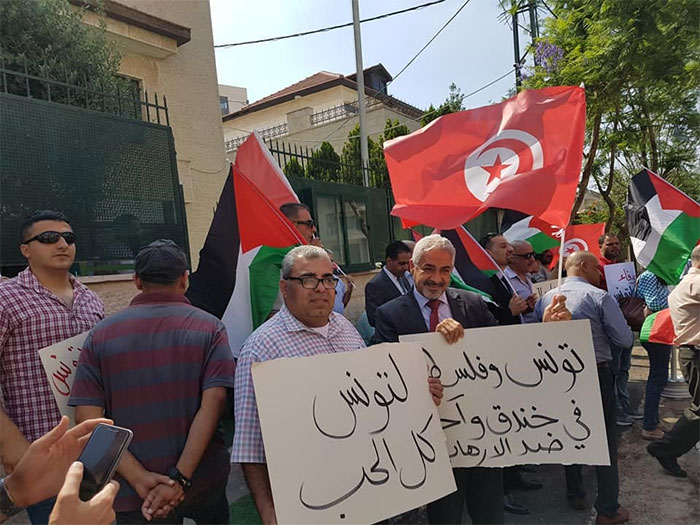 Dans un élan de solidarité qui traduit toute la fraternité et la solidarité, les Palestiniens se sont massivement rassemblés ce dimanche matin devant l’ambassade de Tunisie à Ramallah, cité Etira, en soutien à la Tunisie et de son Président. Drapeaux des deux pays, pancartes, banderoles et bouquets de fleurs ont exprimé ce sentiment profond d’un peuple qui se tient aux cotés des Tunisiens.