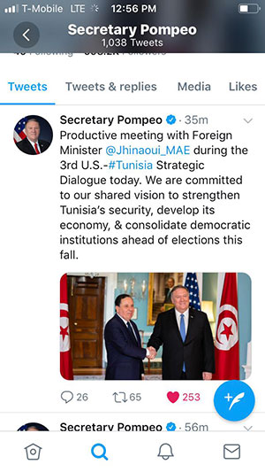 Le ministre Jhinaoui, ajoute la même source s’est félicité des efforts déployés par l’Administration américaine pour soutenir la transition démocratique en Tunisie. De son côté, le secrétaire d’État Pompeo a réitéré la volonté des États-Unis d’Amérique de poursuivre la coopération étroite entre les deux pays dans divers domaines, se félicitant du niveau remarquable atteint entre et des efforts déployés par la Tunisie pour préserver la démocratie. Il a réaffirmé l’engagement des États-Unis d’Amérique de continuer à soutenir la Tunisie dans les domaines politiques, économique et sécuritaire.
