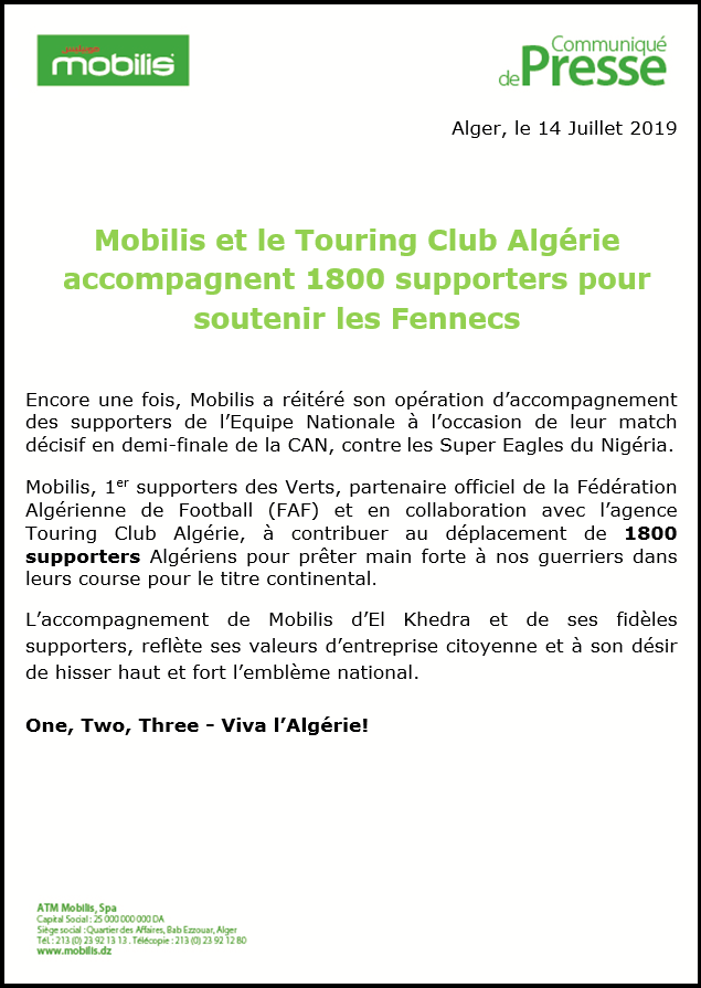 En collaboration avec l’agence Touring Club Algérie, l’opérateur Mobilis a contribué au déplacement de 1800 supporters vers l’Egypte pour assister à la demi finale entre l’Algérie et le Nigeria ce dimanche à 20h. Voici le communiqué de Mobilis à ce sujet :