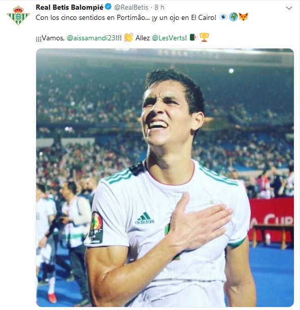 En effet, si le Real Betis est en pleine préparation à Portimao au Portugal, le groupe n’oublie pas Aissa Mandi qui joue ce soir la finale de la CAN face au Sénégal. A travers un message posté sur le compte Twitter du club, le Real Betis a apporté son soutien au défenseur algérien : « Les cinq sens à Portimao… mais on garde un oeil sur le Caire ! Vamos, Aissa Mandi !!! Allez les Verts »