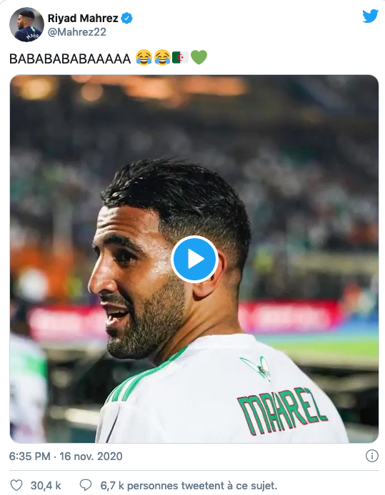Lors de ce match nul face au Zimbabwe, le capitaine des Fennecs, Riyad Mahrez, a inscrit un but d’anthologie, débordant côté droit et enchaînant aile de pigeon et double crochet sur son vis-à-vis avant de conclure d’une frappe croisée comme l’indique Onzemondial. Sur son compte Twitter, le milieu offensif de Manchester City s’est amusé de son chef d’œuvre en postant la vidéo de son but avec comme légende : « BABABABABAAAAA ».