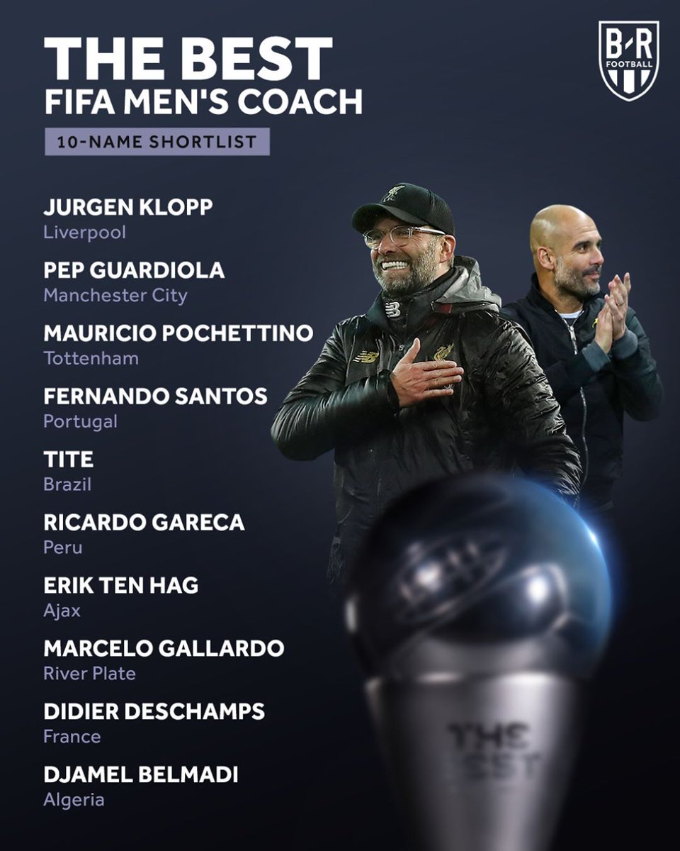 Djamel Belmadi (Algérie), Didier Deschamps (France), Marcelo Gallardo (River Plate), Ricardo Gareca (Pérou), Pep Guardiola (Man City), Jurgen Klopp (Liverpool), Mauricio Pochettino (Tottenham), Fernando Santos (Portugal), Erik ten Hag (Ajax) et Tite (Brésil).