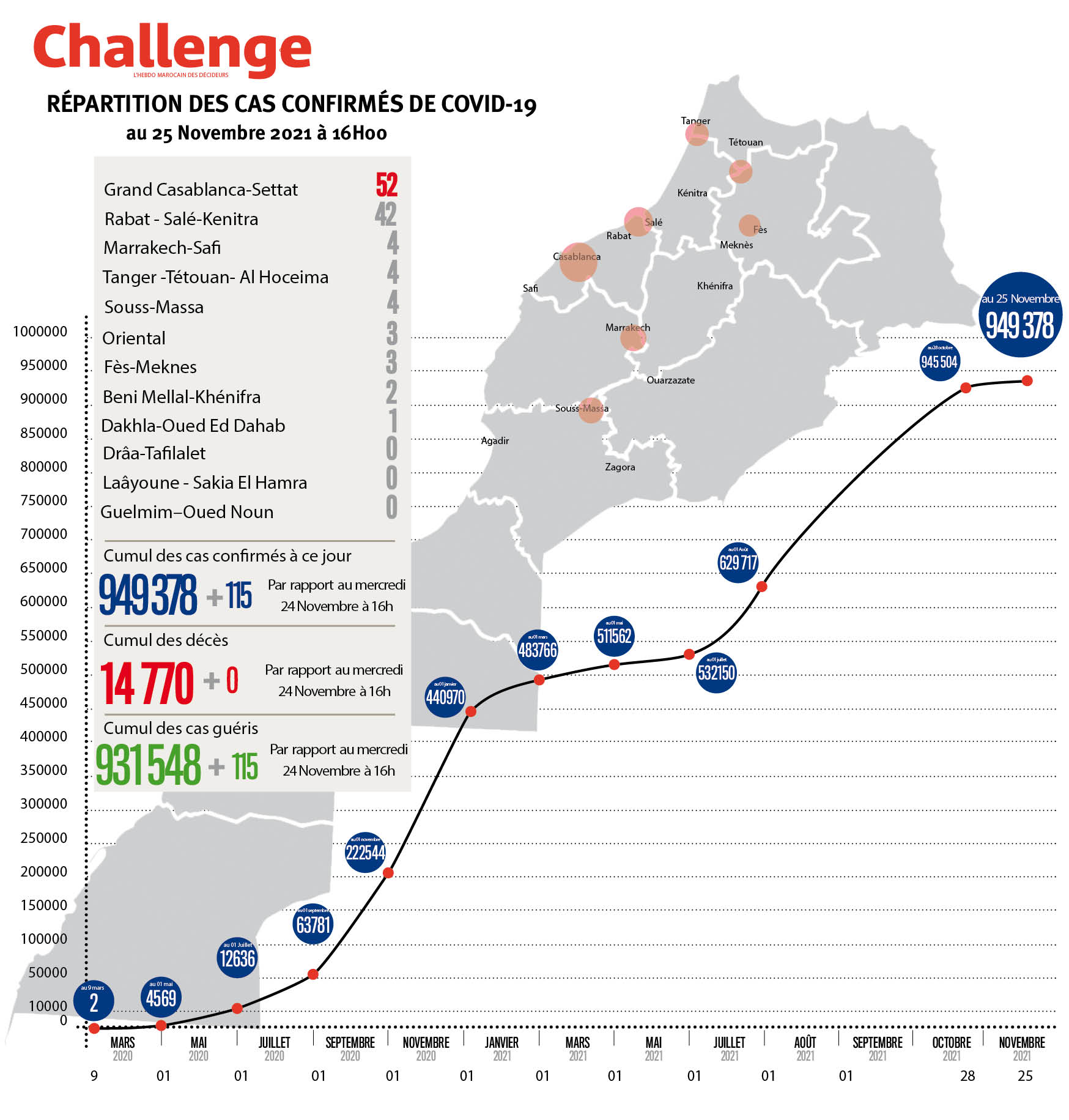115 nouveaux cas d’infection au coronavirus ont été confirmés au Maroc durant les dernières 24h, portant le nombre total de cas de contaminations à 949.378, a annoncé le ministère de la Santé. Le nombre de personnes déclarées guéries s’est élevé à 931.548 avec 115 rémissions supplémentaires, alors que le nombre de décèsAuteur: challenge
