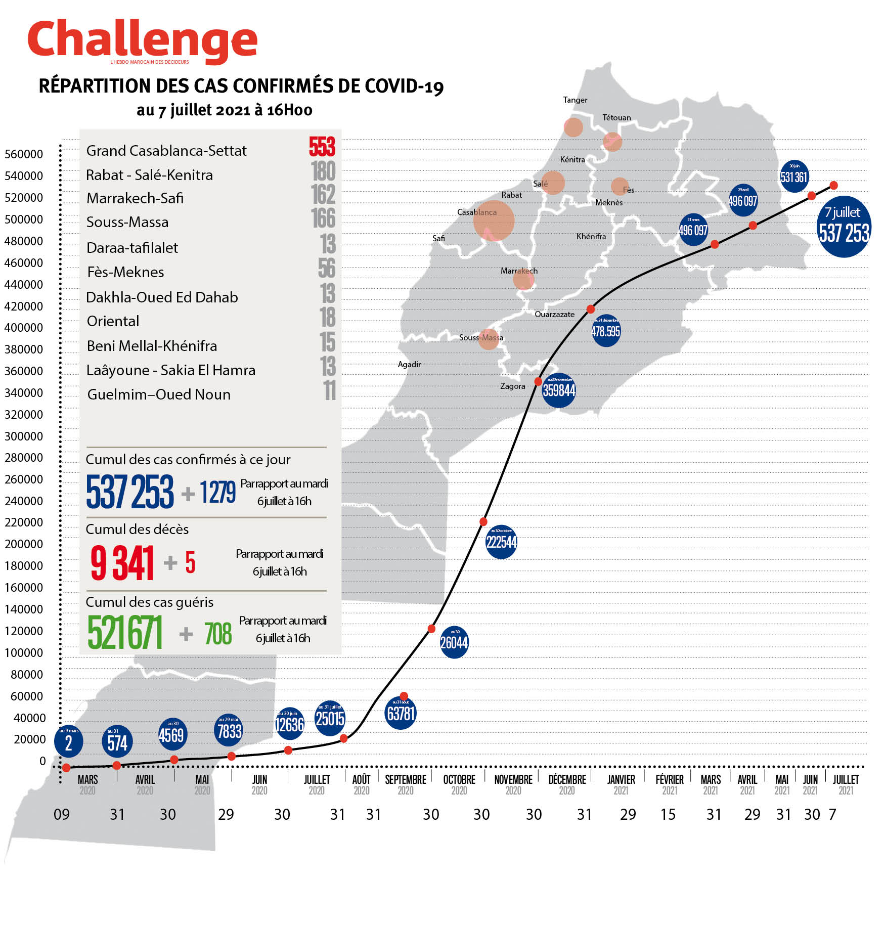 1279 nouveaux cas d’infection au coronavirus ont été confirmés au Maroc durant les dernières 24h, portant le nombre total de cas de contamination à 537.253, a annoncé le ministère de la Santé. Le nombre de personnes déclarées guéries s’est élevé à 521.671 avec 708 rémissions supplémentaires, alors que le nombre de décès a étéAuteur: Karim Handaoui