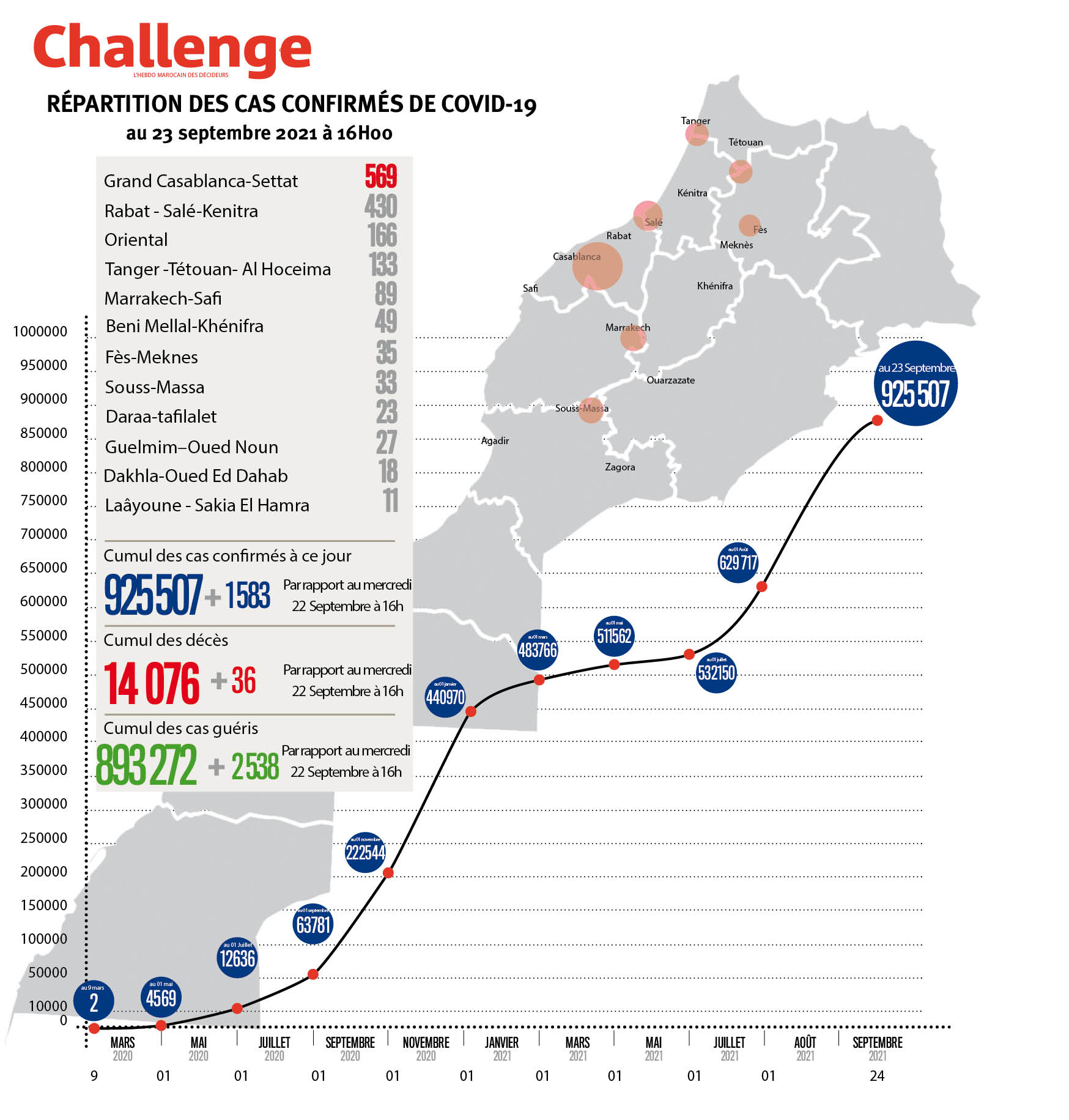 1583 nouveaux cas d’infection au coronavirus ont été confirmés au Maroc durant les dernières 24h, portant le nombre total de cas de contamination à 925.507, a annoncé le ministère de la Santé. Le nombre de personnes déclarées guéries s’est élevé à 893.272 avec 2538 rémissions supplémentaires, alors que le nombre de décès aAuteur: challenge