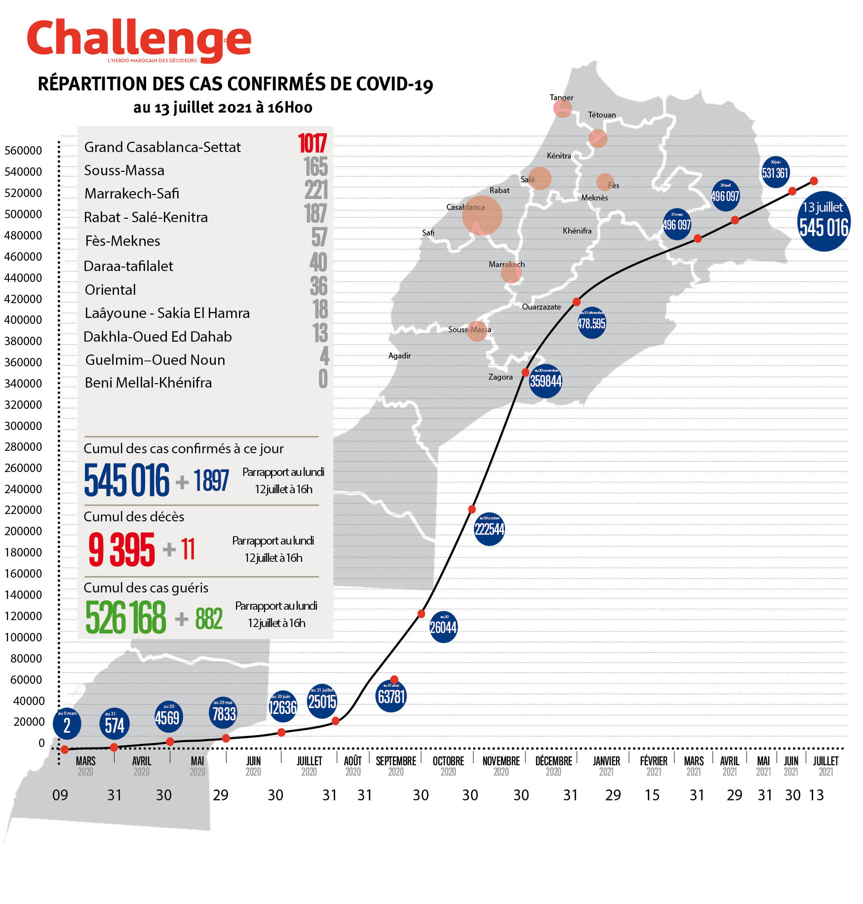 1897 nouveaux cas d’infection au coronavirus ont été confirmés au Maroc durant les dernières 24h, portant le nombre total de cas de contamination à 545.016, a annoncé le ministère de la Santé. Le nombre de personnes déclarées guéries s’est élevé à 526.168 avec 882 rémissions supplémentaires, alors que le nombre de décès a étéAuteur: Karim Handaoui