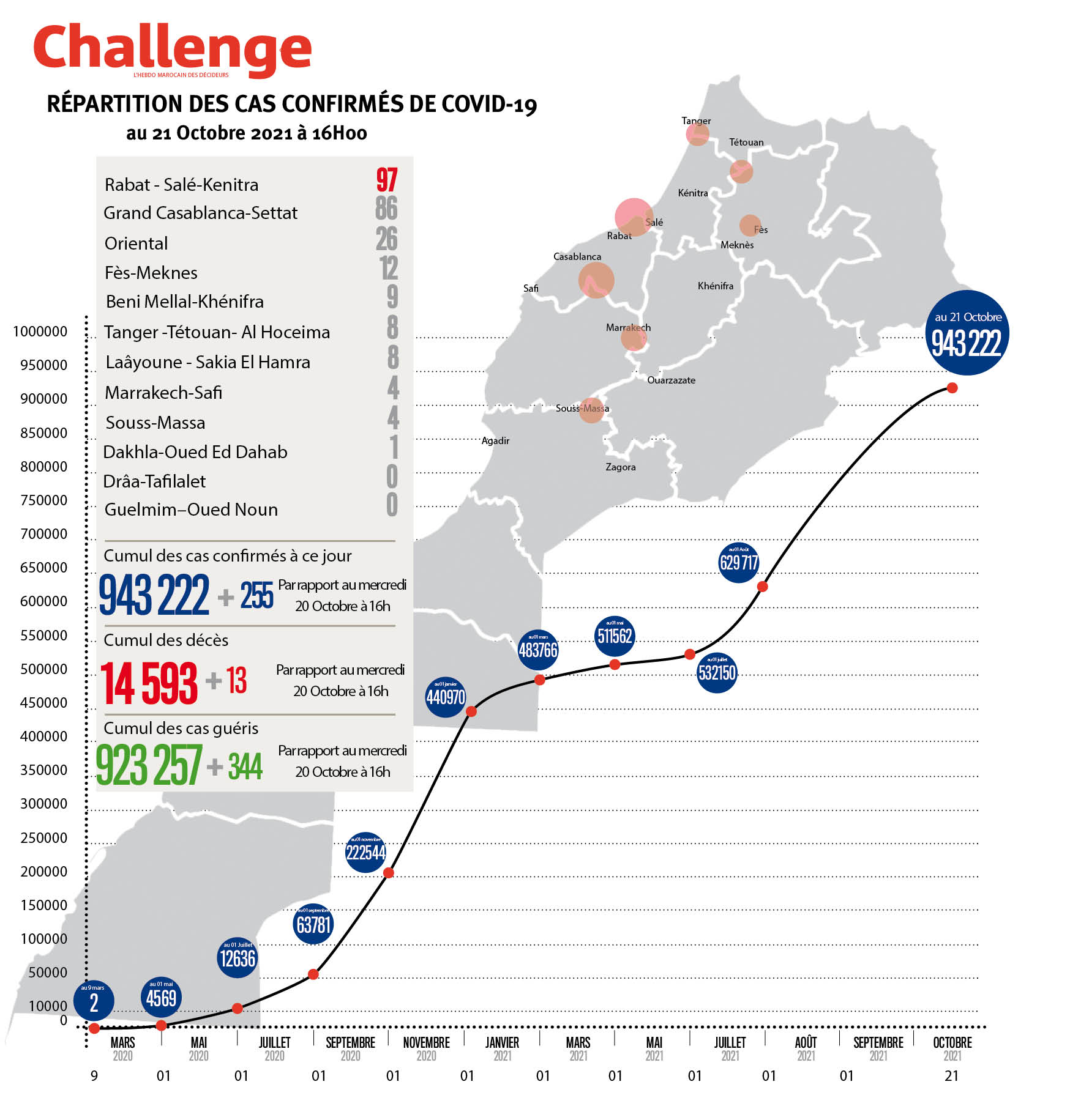 255 nouveaux cas d’infection au coronavirus ont été confirmés au Maroc durant les dernières 24h, portant le nombre total de cas de contamination à 943.222, a annoncé le ministère de la Santé. Le nombre de personnes déclarées guéries s’est élevé à 923257 avec 344 rémissions supplémentaires, alors que le nombre de décèsAuteur: challenge