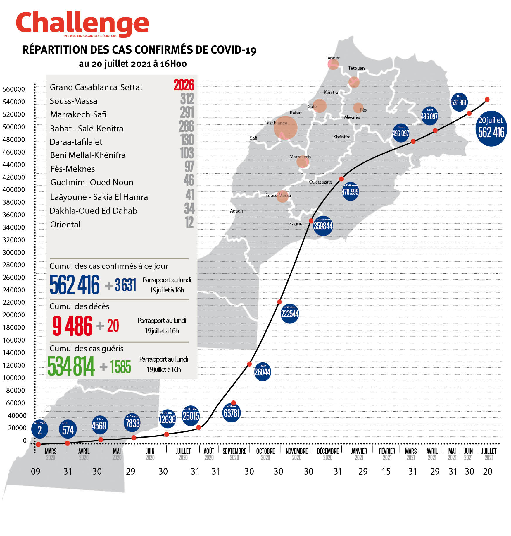 3631 nouveaux cas d’infection au coronavirus ont été confirmés au Maroc durant les dernières 24h, portant le nombre total de cas de contamination à 562.416, a annoncé le ministère de la Santé. Le nombre de personnes déclarées guéries s’est élevé à 534.814 avec 1585 rémissions supplémentaires, alors que le nombre de décès a étéAuteur: Karim Handaoui