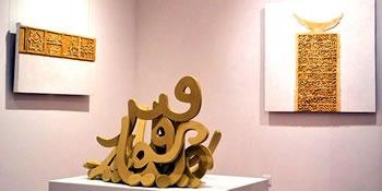 Ici, la temporalité n’est pas scandée par le rythme Passé-Présent-Futur, mais par le rythme Mémoire vivante-Présence-Imagination active. Nous comprenons mieux pourquoi notre artiste-plasticien algérien voyage dans le temps et dans l’espace, en quête des origines, en quête de sens, en quête d’éveil….La calligraphie devient le lieu d’une alchimie entre le souffle de la foi, l’énergie de la pensée et la créativité artistique. L’une des clés qui nous permettrait d’entrer en ce lieu si particulier, façonnée par l’art et le sens, est cette vieille science traditionnelle, la «Science de la lettre» (‘ilm el-huruf), science à la fois esthétique et spirituelle. Le geste calligraphique de notre artiste devient geste ésotérique…» Des lettres, toujours des lettres en arabe, agencées différemment sur différentes toiles sont accrochées sur les cimaises de cette spacieuse galerie. On y trouve aussi des installations. L’alphabet arabe est roi. Les couleurs se marient harmonieusement. Entre le noir et le blanc ou encore le rouge l’or se forge une place de choix. En spirale, sur les mains, le visage ou en cercle, la lettre revêt un attrait mystique, elle est le centre du monde et l’orbite de notre univers, notre vie.