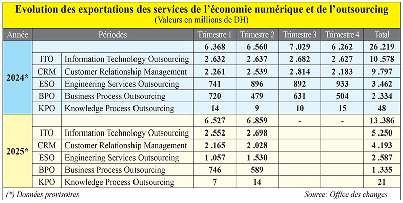En 2024, les exportations des services numériques et d’outsourcing ont atteint environ 26,2 milliards de DH, en légère hausse de 0,2% par rapport à 2023. Au premier semestre 2025, elles ont déjà progressé de 3,5%, atteignant 13,4 milliards de DH