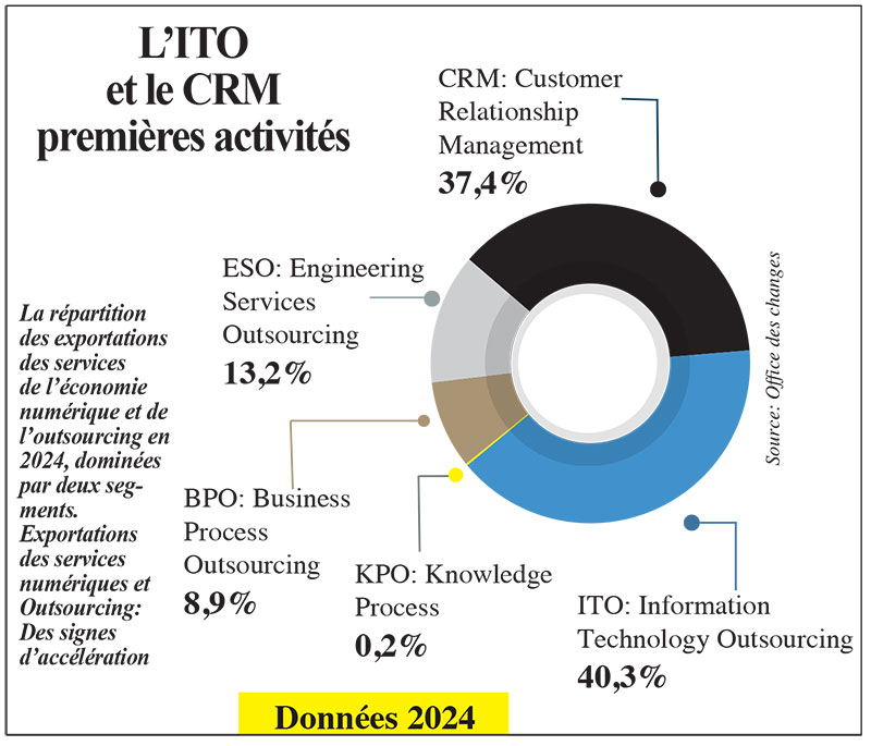 La structure des exportations en 2024 confirme la dominance de deux écosystèmes. Les services informatiques et technologiques (ITO) représentent 40,3% des recettes totales, soit 10,578 milliards de DH, tandis que les services de gestion de la relation client (CRM), principalement les centres d’appels, pèsent 37,4%, soit 9,797 milliards de DH. Ensemble, ces deux segments concentrent plus de 77% des exportations du secteur. Les autres composantes restent minoritaires mais affichent des évolutions contrastées. L’externalisation des services d’ingénierie (ESO) progresse à 3,462 milliards de DH (+7,1% vs 2023), le BPO (Business Process Outsourcing) atteint 2,334 milliards de DH (+16,9%). Tandis que le KPO (Knowledge Process Outsourcing) recule à 48 millions de DH en 2024, contre 78 millions de DH en 2023.