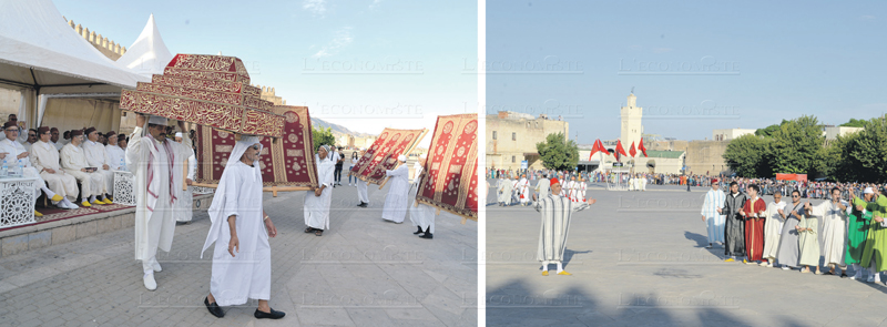 Comme à l’accoutumée, l’ouverture du moussem est marquée par la présentation du catafalque ou «kessoua» par les chorfas idrissides. Draperie ornée d’inscriptions coraniques brodées au fil d’or, la couverture de la tombe du fondateur de la ville de Fès est renouvelée annuellement. Elle est cousue à la main et sa confection nécessite plusieurs mois de travail.