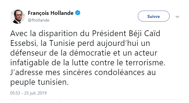 L’ancien président français, François Hollande a présenté ses condoléances au peuple tunisien, à travers un tweet qu’il a publié suite au décès du président de la République, Beji Caïd Sebsi.