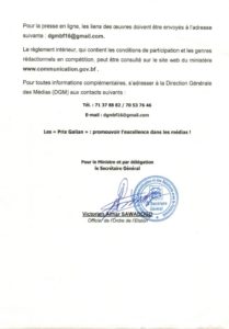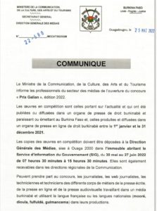 Le ministère de la Communication, de la Culture, des Arts et du Tourisme vient de lancer les « Prix Galian ». Sont concernées par le concours, les œuvres qui ont été publiées ou diffusées, entre le 1er janvier et le 31 décembre 2021, dans un organe de presse de droit burkinabè.