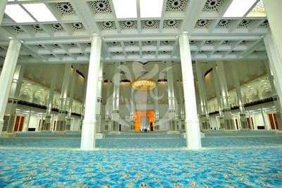 A l’intérieur, la Mosquée se démarque par les 618 colonnes octogonales dressées dans la grande salle de prière et décorées de marbre avec des veinures d`un blanc éclatant et par les 6 (six) kilomètres d`écritures calligraphiques, dont certaines ont été gravées sur du marbre et de la pierre avec un système de laser, décorant la salle de prière ainsi que les différents autres espaces du monument.