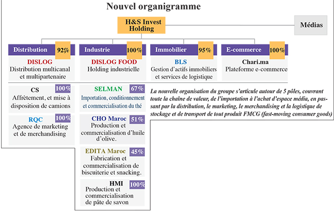 Trois filiales se partageront ainsi l’activité du pôle «Distribution». Il s’agit de Dislog (multicanal et multipartenaire), CS (affrètement et mise à disposition de camions) et RQC (agence marketing et de merchandising). Le pôle «Industrie» se décline, lui, en 5 entreprises: Dislog Food (holding industrielle), Selman (importation, conditionnement et commercialisation du thé), CHO Maroc (production et commercialisation d’huile d’olive), Edita Maroc (fabrication et commercialisation de biscuiterie et snacking) et HMI (production et commercialisation de pâte de savon).