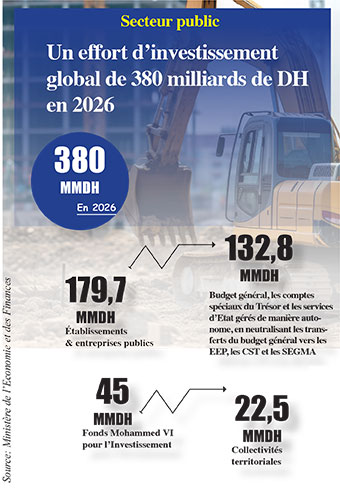 Selon la note de présentation du PLF 2026, l’effort d’investissement global du secteur public s’élève à 380 milliards de dirhams pour l’année prochaine