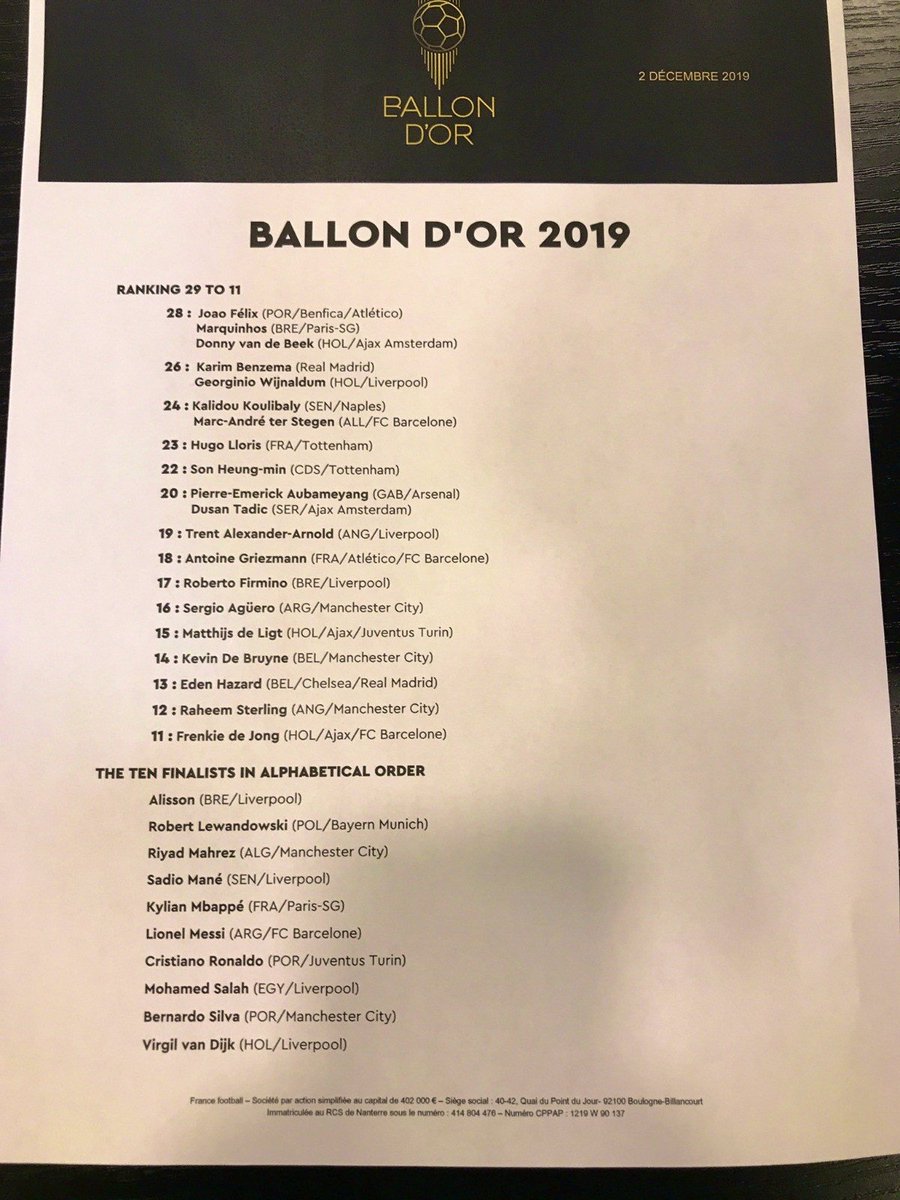 Parmi ceux-ci, quatre vainqueurs de la Ligue des Champions avec Liverpool, à savoir Alisson Becker, Virgil van Dijk, Sadio Mané et Mohamed Salah. Deux joueurs de Manchester City, Bernardo Silva, vainqueur de la Ligue des Nations, et Riyad Mahrez, champion d’Afrique, feront également partie du TOP 10, au même titre que Lionel Messi (Barcelone), Robert Lewandowski (Bayern), Cristiano Ronaldo (Juventus) et Kylian Mbappé (Paris SG).