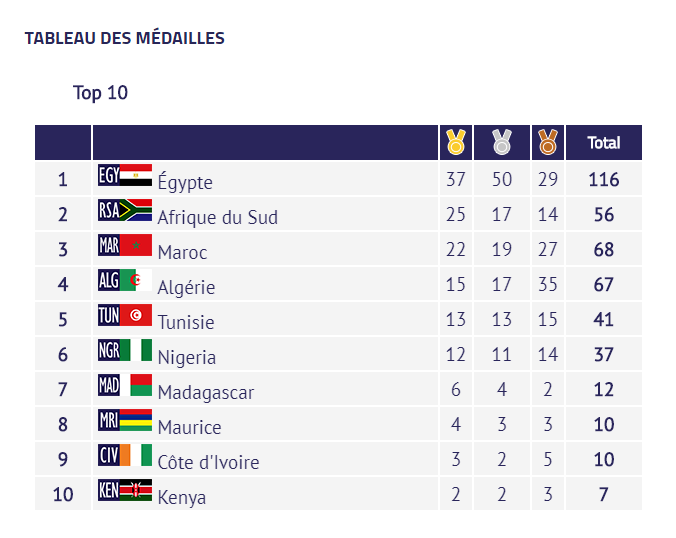 Avec ces résultats, le Maroc renforce sa position à la la troisième place avec 18 médailles d’or, 16 médailles d’argent et 26 médailles de bronze, tandis que l’Egypte maintient sa position en tête du classement avec 109 médailles: 36 médailles d’or, 47 d’argent et 26 de bronze.