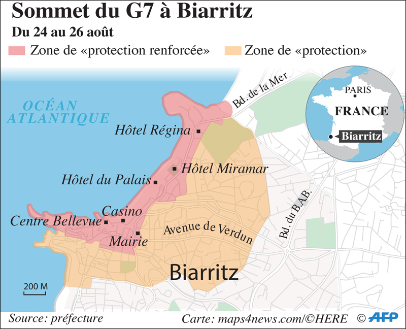 ■ Une mobilisation exceptionnelle: Pour ce premier G7 organisé en France depuis 2011, les autorités ont prévu une mobilisation exceptionnelle des forces de l’ordre, selon le ministre de l’Intérieur Christophe Castaner. A Biarritz, où une zone rouge ultra-sécurisée sanctuarisera les lieux de rendez-vous, mais aussi dans les villes voisines de Bayonne et Anglet et jusqu’à la frontière espagnole, «on se prépare à l’hypothèse (de) contre-manifestations. Si elles sont violentes, nous les neutraliserons», a averti Castaner, qui a effectué une visite à la station balnéaire le 4 juillet dernier. Plusieurs dizaines de groupes opposés au sommet ont prévu de mener des actions de «désobéissance civile pacifique», notamment durant un contre-sommet du 19 au 23 août à Hendaye et Irun (Espagne), à une trentaine de km de Biarritz.