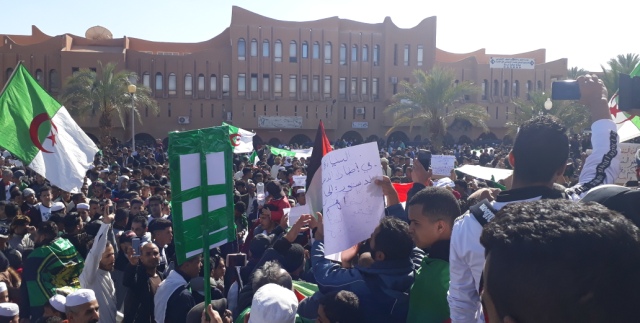 Nous avons rencontré une dame, fille de Moudjahid venue de Boufarik pour participer à la marche. Elle était entourée d’une bande de jeunes qui la protégeaient des éventuelles bousculades. Pour en revenir à la marche de ce 6ème vendredi, elle ne différait pas beaucoup des précédentes si ce n’est que cette fois ci, il y avait beaucoup plus de femmes, de jeunes filles et de familles entières, dont certaines précédaient la foule dans des voitures recouvertes de l’emblème national. Les slogans, eux par contre, ont évolués en fonction des nouvelles propositions et avancées des demandes du peuple. « Non à l’article 102 » est celui qui revenait le plus souvent avec celui, nouveau, « Ni Salah, ni Bensalah », allusion à Gaïd Salah et le président du sénat. Et comme d’habitude, la marche la plus importante et celle qui a absorbée toutes celles rencontrées en cours de route, comme une boule de neige, est celle entamée à partir du quartier de Sidi Abbaz qui en arrivant à El Harrameïne aux abords de Béni Izguène, a « embarquée » une procession de jeunes et moins jeunes du K’sar de Béni Izguène , avant « d’engloutir» , sur le boulevard du 5 Juillet , au carrefour de Merrakchi une autre procession du quartier populeux et populaire de Theniet El Makhzen , en compagnie de laquelle ils ont longé toute l’avenue du 1er Novembre, longue de 2000 mètres, puis le boulevard Emir Abdelkader , avant de bifurquer par l’avenue Talbi Ahmed , où elle a été rejointe par trois autres processions provenant des quartiers de Hay El Moudjahidines , plus connue sous le nom de Zgag Lihoud, Hadj Messaoud et Ben Smara pour aller tous ensemble crier leurs slogans sur la très large esplanade du 1er Mai , lieu emblématique de Ghardaïa pour toutes les manifestations ou contestations populaires .